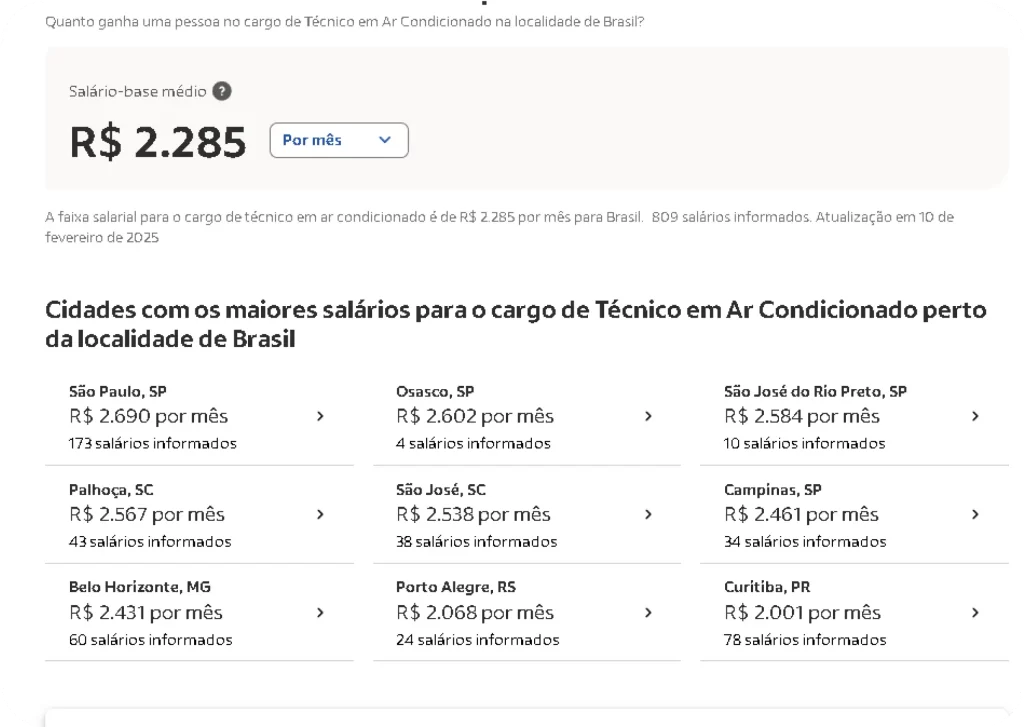 O salário médio de um Técnico em Ar-Condicionado no Brasil é de R$ 2.289/mês, podendo variar conforme a região e experiência.